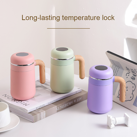 Tazas de café de oficina con temperatura de pantalla inteligente con mango de grano de madera personalizada nueva taza de aislamiento inteligente de acero inoxidable 480ML 316